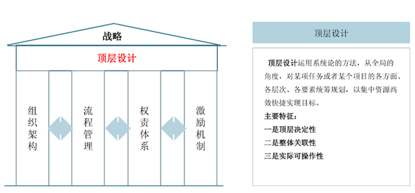 頂層設(shè)計是一個系統(tǒng)工程,涵蓋戰(zhàn)略、組織、流程和制度等多種組成部分,管理模式的變革是建立在頂層設(shè)計之上。